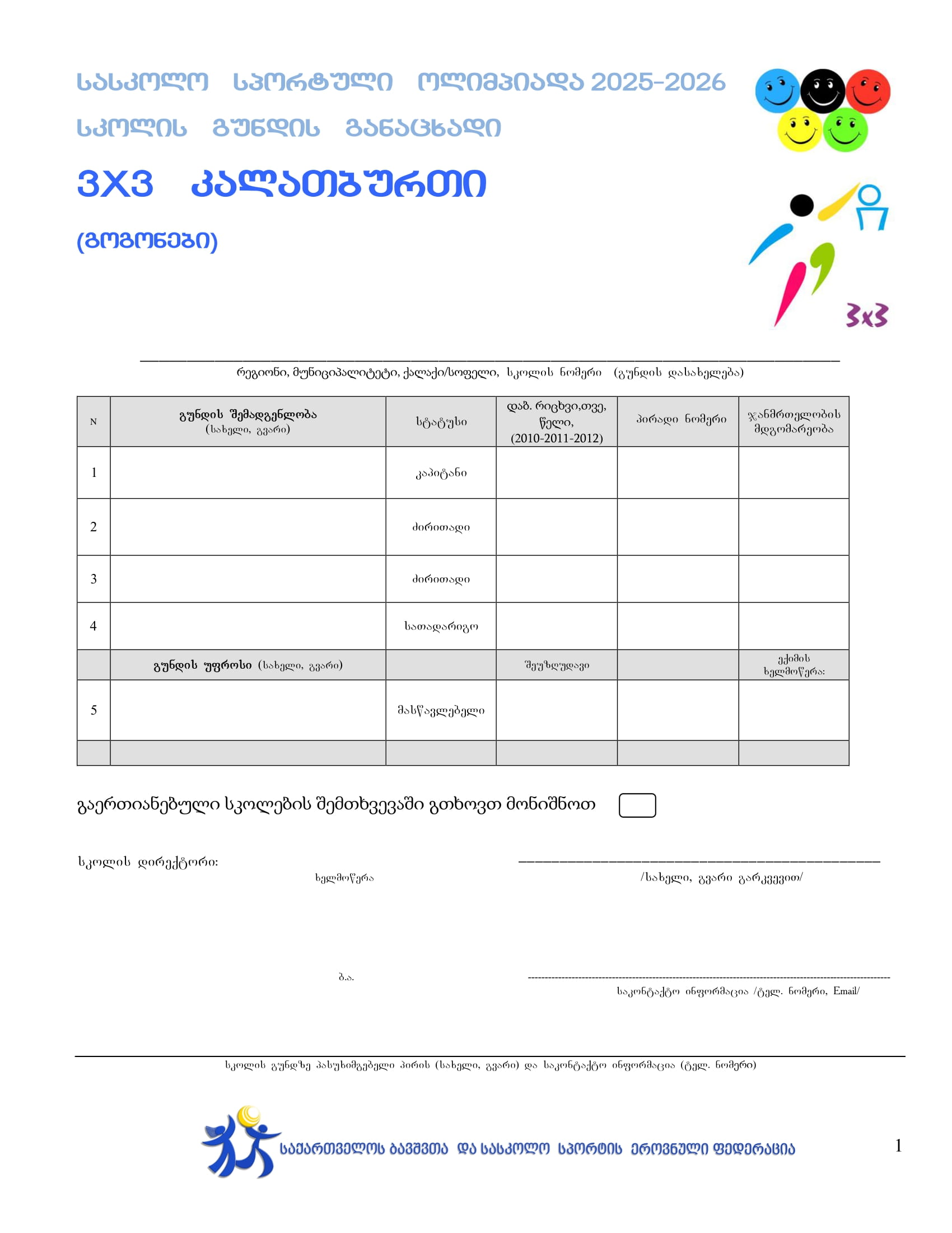განაცხადის ფორმა - 3x3 კალათბურთი (გოგონები)